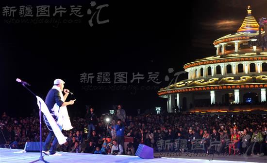 7月29日晚,在和布克赛尔蒙古自治县成立60周年文艺晚会上,来自内蒙古的额尔古纳乐队成员在为观众演唱歌曲《鸿雁》。