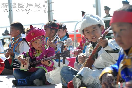 7月30日,在和布克赛尔蒙古自治县成立60周年庆祝大会上,当地牧区的小朋友们在合奏民族乐器托布秀尔。