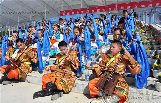7月30日,在和布克赛尔蒙古自治县成立60周年庆祝大会上,当地小朋友们在进行马头琴合奏。
