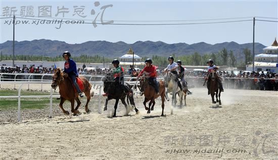 7月30日,在和布克赛尔蒙古自治县成立60周年庆祝大会上,当地小选手参加15公里耐力赛马。