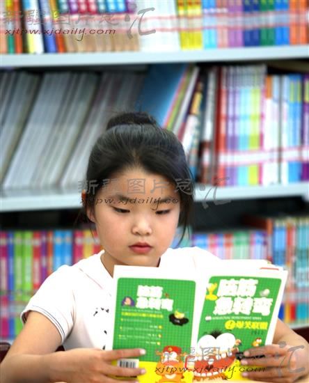 2014年7月30日,小学生在白碱滩区图书馆学生专区看书学习。