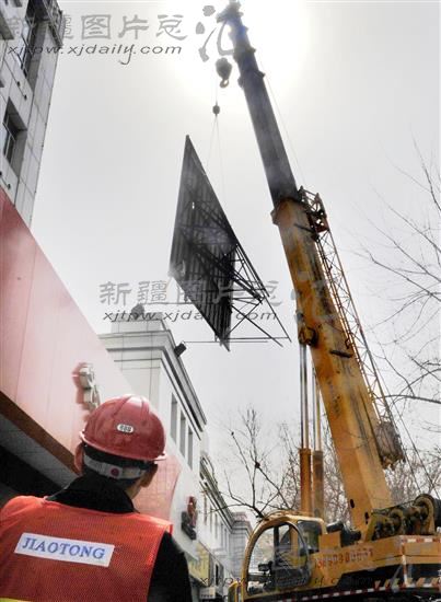 2012年3月31日,工人正在拆除违章广告牌。当日,乌鲁木齐市沙依巴克区青少年校外活动中心和黄河路街道综合治理工作等今年首批13个民生建设项目动工开建。此次13个开工建设项目涉及居民出行、就医、就学等民生和环境建设等内容,共计投资6.69亿元。