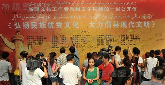 2014年8月15日,来自我区文化系统的千余名各族优秀文化工作者在主题为“弘扬民族优秀文化 大力倡导现代文明”——新疆文化工作者致维吾尔族同胞的一封公开信上签名,号召维吾尔族同胞热爱自己悠久的历史文化,与宗教极端势力做斗争,建设稳定和谐的新疆。