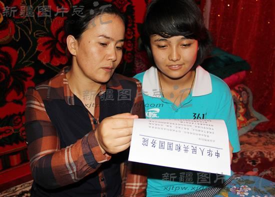 2014年8月15日,江苏省南京市浦口高级中学新疆班高一学生古丽米热·米提吾,在库尔勒市的家中和母亲古丽齐曼一起阅读李克强总理给自己的回信。