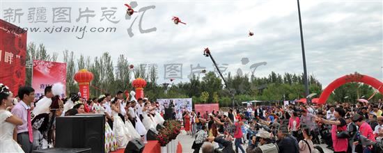 2014年8月18日,新人们在集体婚礼上向群众抛洒花束。