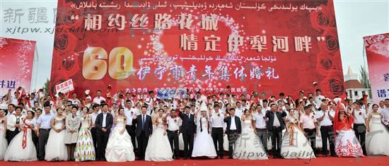 2014年8月18日,60对新人参加在伊犁河畔举行的“相约丝路花城 情定伊犁河畔”的集体婚礼,将整个庆祝活动推向高潮。
