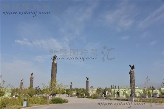 这是8月16日拍摄的达坂城区阿克苏乡“鹰舞广场”上充满哈萨克族民俗风情的雕塑,四周是别具特色的“鹰舞庄园”别墅。
