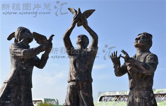 这是8月16日拍摄的达坂城区阿克苏乡“鹰舞广场”上充满哈萨克族民俗风情的雕塑,四周是60栋别具特色的哈萨克族牧民定居的“鹰舞庄园”别墅。