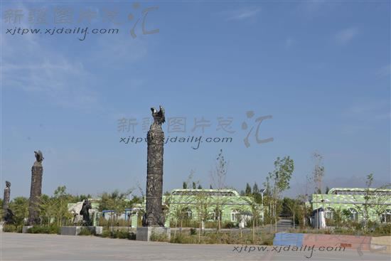 这是8月16日拍摄的达坂城区阿克苏乡“鹰舞广场”上充满哈萨克族民俗风情的雕塑,四周是别具特色的“鹰舞庄园”别墅。