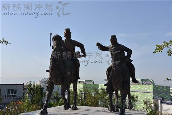 这是8月16日拍摄的达坂城区阿克苏乡“鹰舞广场”上充满哈萨克族民俗风情的雕塑,四周是60栋别具特色的哈萨克族牧民定居的“鹰舞庄园”别墅。