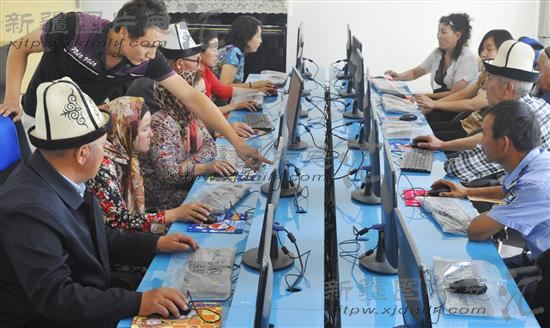 2014年8月16日,乌恰县坎久干社区党员干部群众在利用远程教育网络进行学习。