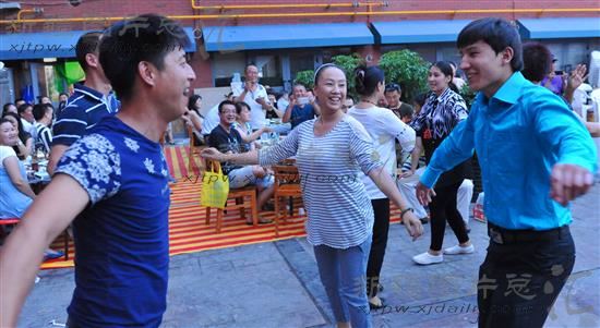 2014年8月18日傍晚,在克拉玛依市南湖美食城夜市上,各族群众跳起欢快的麦西来甫。