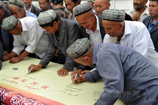 2014年8月18日,沙雅县海楼乡亚当村群众在集体签名,自觉维护民族团结和社会稳定。