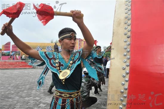 8月19日,勇士在锡伯族先贤图伯特公祭大典上擂鼓。