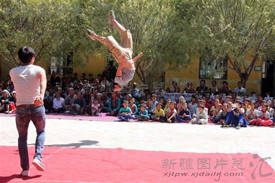 2014年8月19日,岳普湖县返乡学生在也克先拜巴扎乡曲如奇村小学开展文艺活动。