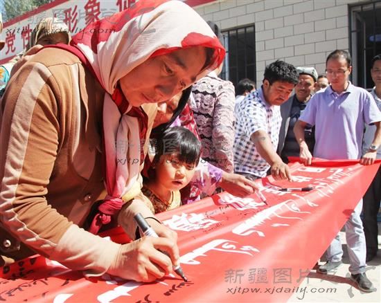 2014年8月20日,阿克苏市阿依库勒镇阔纳巴扎村村民在“反恐维稳千人宣誓”活动中签名。