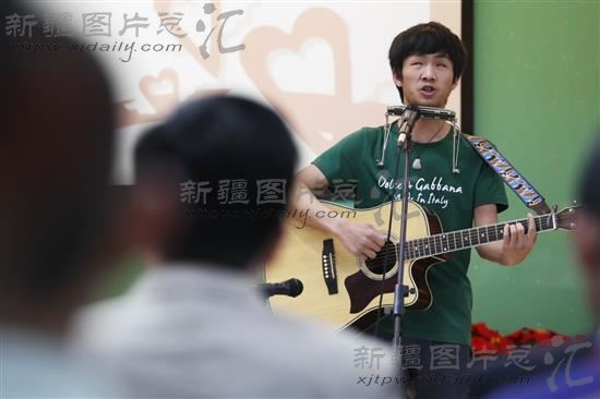 2012年5月17日,来自乌鲁木齐水磨沟区残联的盲人景小波在表演唱。当日,乌鲁木齐市图书馆推出了“携手同行、文化共享”主题活动。在活动上,乌市残联向该图书馆捐赠了2万元,用于增加方便残障人士查询、阅读的设施。同时,该图书馆也向残障读者代表赠送了图书及购书卡,以丰富残障读者的文化生活。