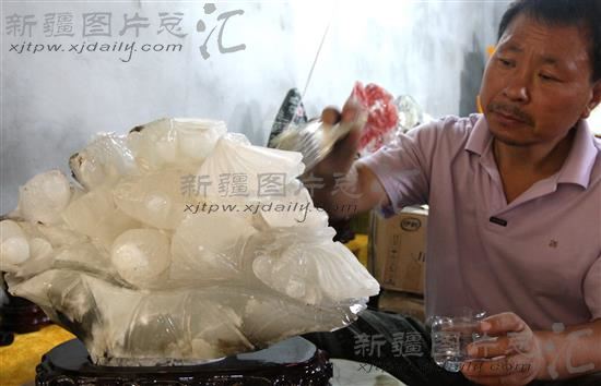 2014年8月23日,来自山东的参展商正在“2014中国·新疆赏石古玩花卉博览会”打理自己的藏品。