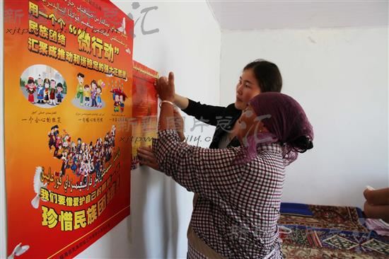 2014年8月22日,福海县齐干吉迭乡的农牧民们在张贴民族团结宣传挂图。