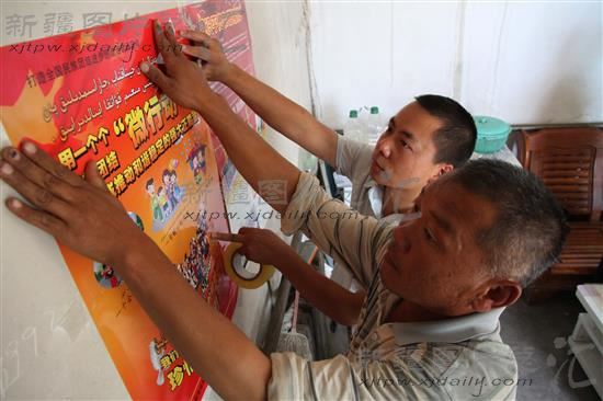 2014年8月22日,福海县齐干吉迭乡的农牧民们在张贴民族团结宣传挂图。