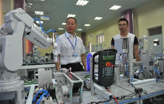 2014年8月21日,教师在哈密职业技术学院机电一体化教学工作室熟悉新设备。