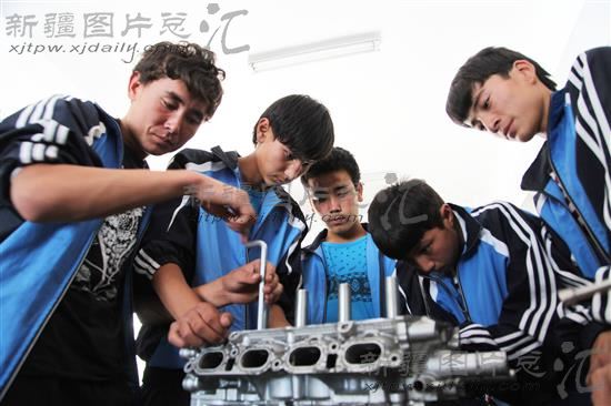 2014年6月24日,伊宁县职教中心汽车维修培训实习基地的学员在学习汽车修理技术。