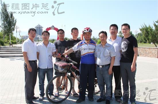 2014年6月29日,湖北省枣阳市67岁老人卢开富骑单车抵达新疆精河县,看望那里的援疆干部。这是老人与援疆干部合影留念。