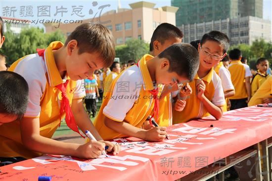 2014年8月25日,拜城县第二小学全体教师和学生在签名。