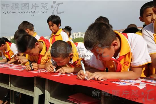 2014年8月25日,拜城县第二小学全体教师和学生在签名。