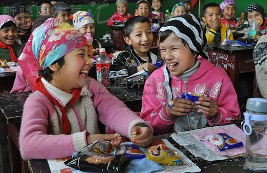 2012年5月4日,阿图什市松他克乡阿孜汗村小学四年级二班学生在课间食用营养餐。今年春季新学期开始,我区农村义务教育学生营养改善计划启动实施,惠及全疆91.7名万农村中小学生。