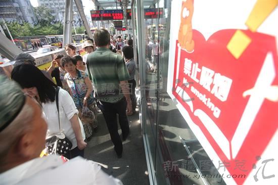 2012年5月30日,乘客从BRT候车通道走过,记者看到,随着在公共场所禁烟宣传力度的加大,目前在首府医院、商场、BRT候车室等特殊公共场所内均在明显的位置放置有禁止吸烟的标志。