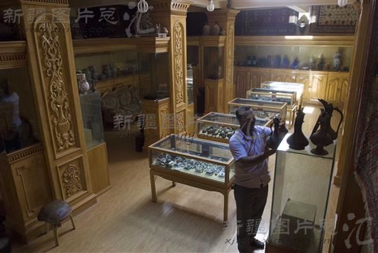 2014年8月23日,老城区私人博物馆馆主尼瓦尔·买卖提艾力在整理展品。