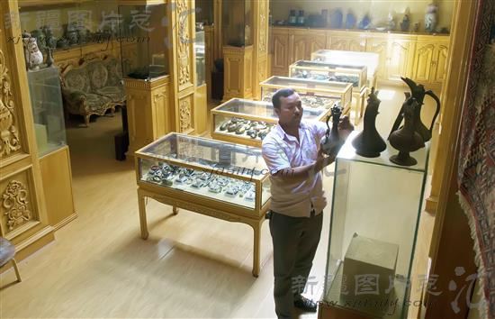 2014年8月23日,老城区私人博物馆馆主尼瓦尔·买卖提艾力在整理展品。