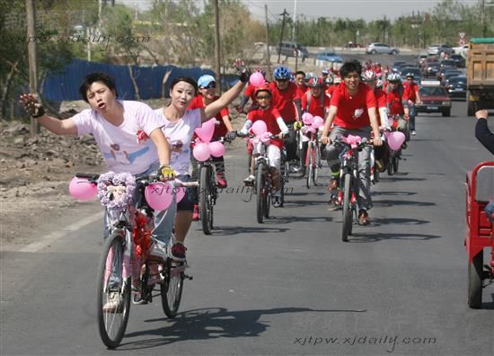 2012年5月27日,自行车骑行发烧友、新郎李根和新娘史绍珺在骑友的簇拥下走过乌市大街小巷。当日,乌市17个俱乐部的300余名自行车骑行发烧友为一对新人举办了低碳环保的自行车骑行婚礼。这一简单特别的浪漫婚礼,获得了素不相识的路人的祝福。