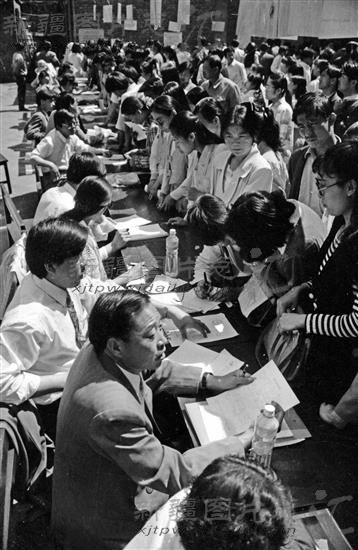 1995年5月20日,乌鲁木齐市人才市场上求职的人们。