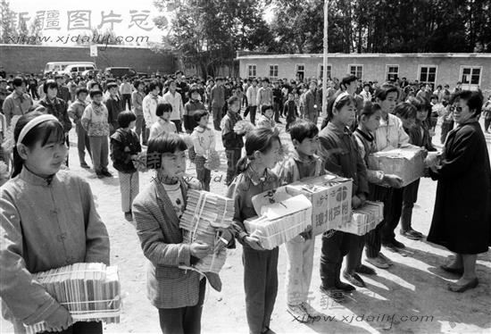 1995年5月30日,乌鲁木齐市达坂城区东沟乡小学的10名辍学失学女童重返校园。图为失学学生领到了新课本。