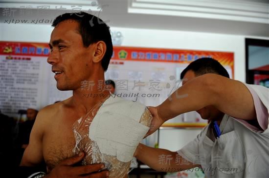 2014年8月27日,工作人员在伊宁县残联给该县阿热吾斯塘乡布拉克贝希村一名残疾人士进行假肢取形。
