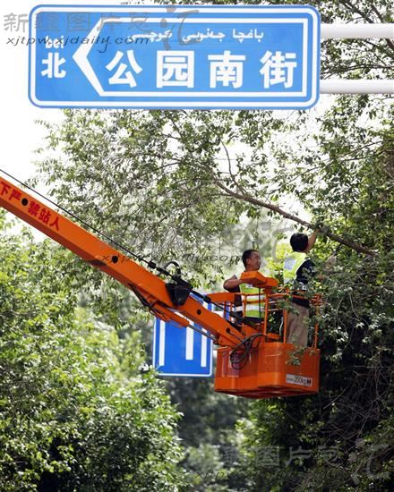 2012年6月13日,乌鲁木齐市沙依巴克区园林队的工作人员,在于田街上对路两边的树木进行修剪。据了解,该区今年计划投资1600万元,对100条主次干道进行功能提升,包括路灯亮化、草坪砖更换、人行道修补、环卫设施配备等各个方面,为辖区居民打造更加优美整治的出行环境和休闲娱乐环境。