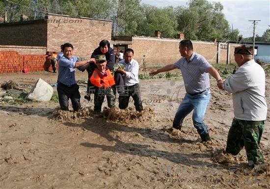 2012年6月20日,救援人员在阿勒泰市拉斯特乡转移被困洪水中的群众。
