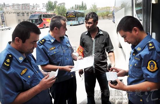 2012年6月26日,新疆阿克苏地区库车县道路运输管理局工作人员在客运站对长途车辆安全进行检查。今年该县进一步加强全县道路运输行业安全监管工作,严厉打击非法违法生产经营行为,维护了广大人民群众的生命安全。