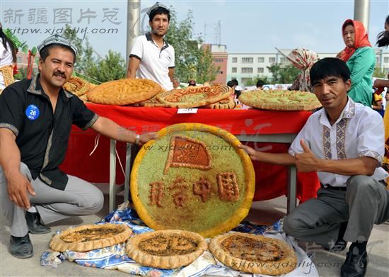 2014年8月29日,参赛者在沙雅县科技文化艺术中心技能大赛上展示工艺馕。