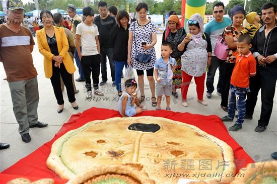 2014年8月29日,在沙雅县职业技能大赛上,参赛者烤制的巨型馕吸引了参观者的眼球。