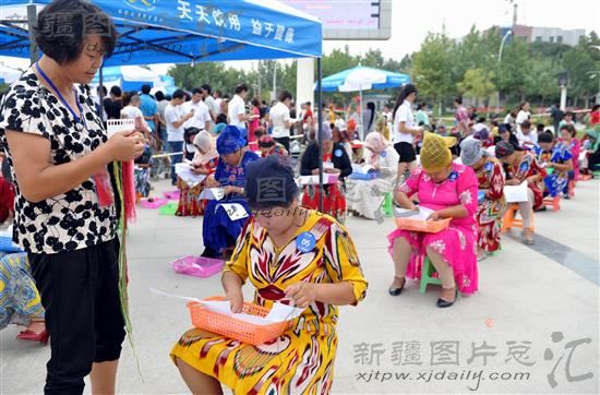 2014年8月29日,来自沙雅县乡村一线的绣娘正在该县科技文化艺术中心广场参加技能大赛。