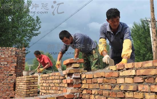 2012年7月6日,新疆伊犁哈萨克自治州尼勒克县种蜂场管委会阿克吐拜队,施工人员在修建安居富民房。震后第6天,受灾群众正常生产生活已恢复,灾区安居富民房建设也全面开工。