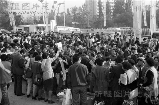 1995年10月10日,数千名热心读者在乌鲁木齐人民会堂门前争先恐后的索取报刊杂志。