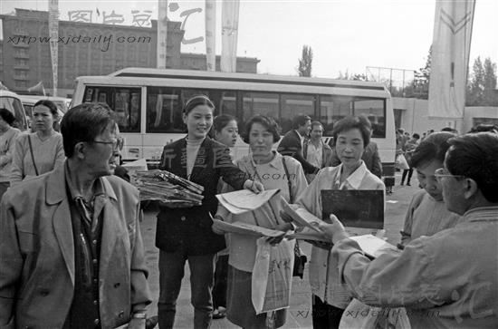 1995年10月10日,新疆日报社党办的同志放弃节假日,向广大市民宣传新疆日报。