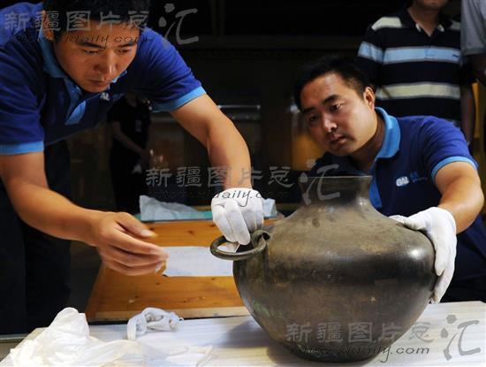 2012年7月4日,自治区博物馆工作人员在整理来自内蒙古博物馆的文物《 “大员”铭文铜壶》。当日,来自内蒙古博物馆的102件展品,70%的展品为国家一级文物,在自治区博物馆开箱布展。据了解,7月中旬《成吉思汗--中国古代北方草原游牧文明展》将在自治区博物馆展出。