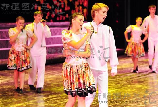 2012年7月23日,小演员在表演民族歌舞。当日,由新疆对外友好协会主办的第三届中国·新疆国际少儿艺术节文艺汇演暨闭幕式在新疆人民大会堂举行,来自俄罗斯、韩国、哈萨克斯坦等七个国家及新疆8个艺术团队的近300名小朋友登上舞台,用舞蹈和歌声,展示了不同民族的风土人情和文化艺术。