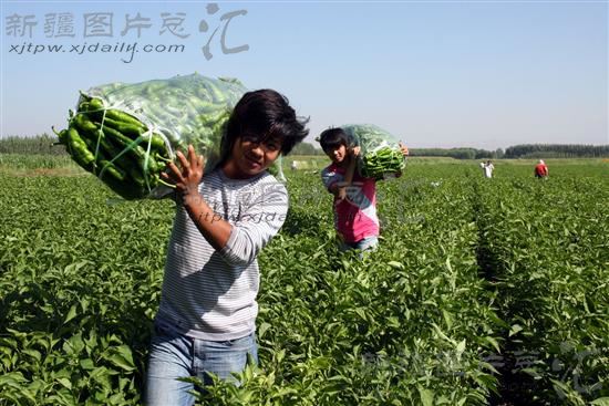 2012年7月18日,农民在搬运丰收的大田辣椒。近几日,察布查尔锡伯自治县绰霍尔乡种植的2700亩大田辣椒喜获丰收。今年,该乡引进推广了伊犁大辣椒、绿亨椒王、特大牛角椒等新品种27个,推广面积达90%以上,该乡大田辣椒逐渐成为农民增收致富的新途径。