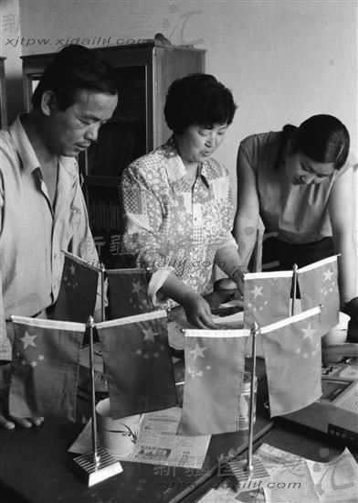 沙湾县机关及企业事业单位职工在办公桌上摆放国旗,以此增强工作责任心和爱国热情(1995年7月3日)。
